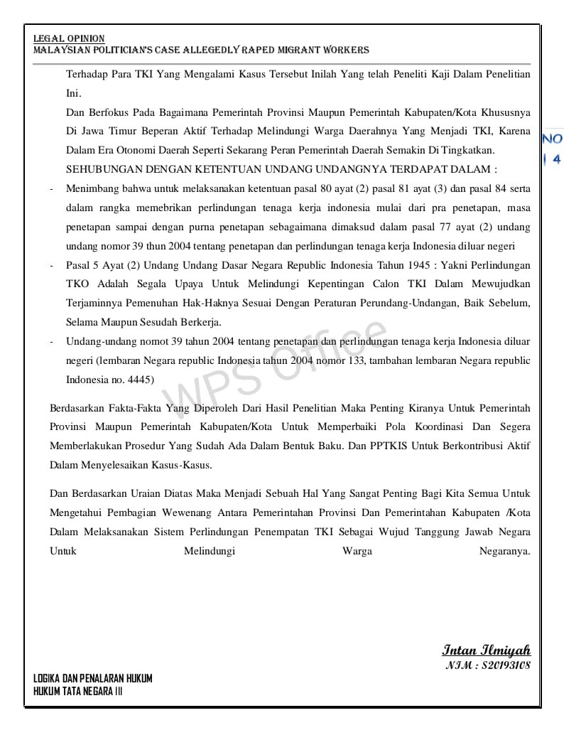 TUGAS LEGAL OPINION Tentang MALAYSIAN POLITIK CASE ALLEGEDLY RAPED MIGRANT WORKERS